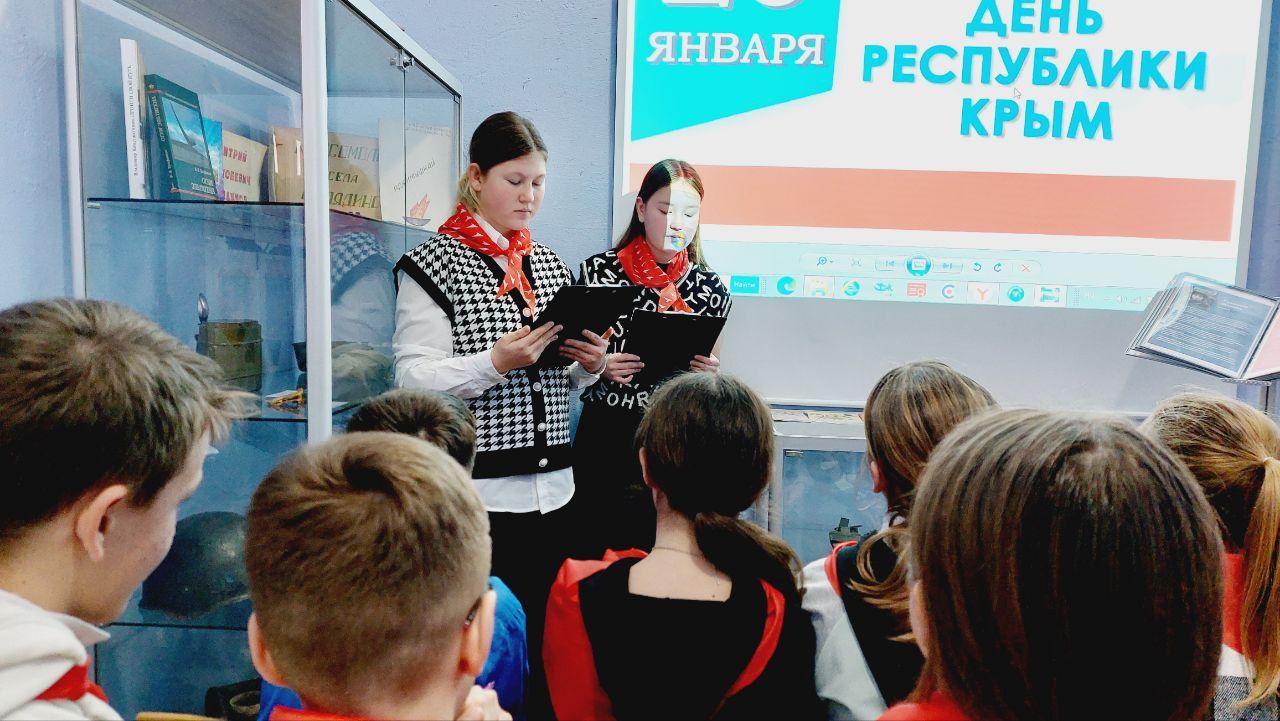 20 января — День Республики Крым. В школьном музее педагог дополнительного образования Желтырёвой Н.В. совместно с лидерами ученического самоуправления провела мероприятие, посвящённое этому значимому празднику. Благодаря данному мероприятию обучающиеся вновь ощутили чувство патриотизма и гордости за свой родной край.